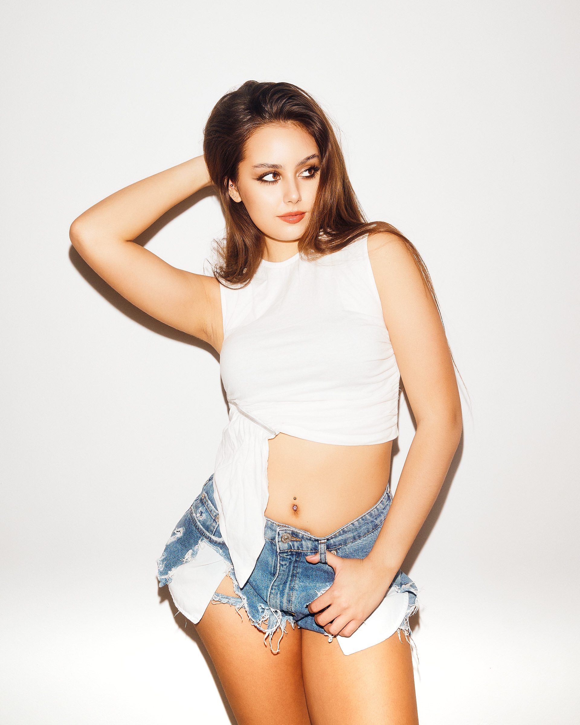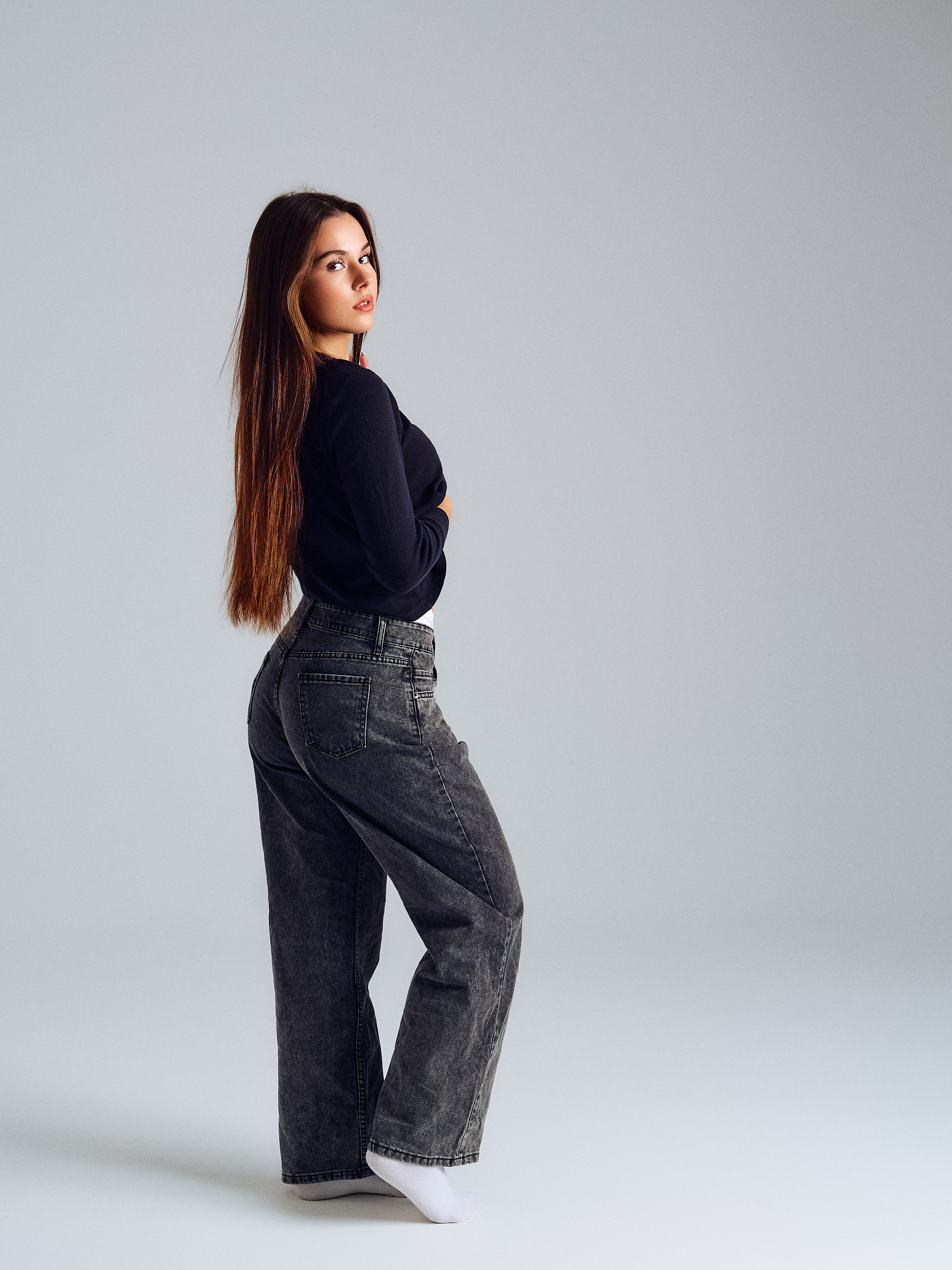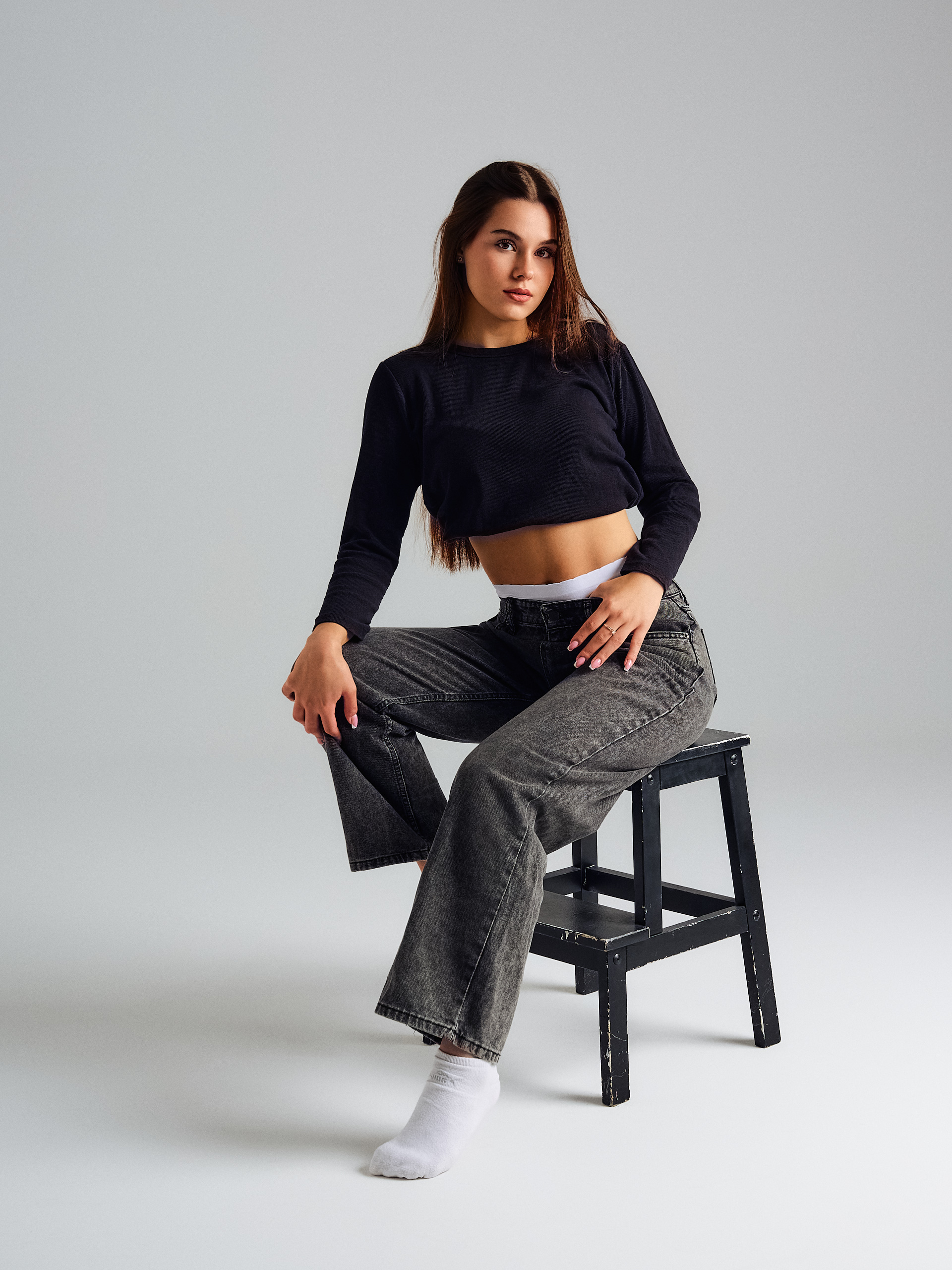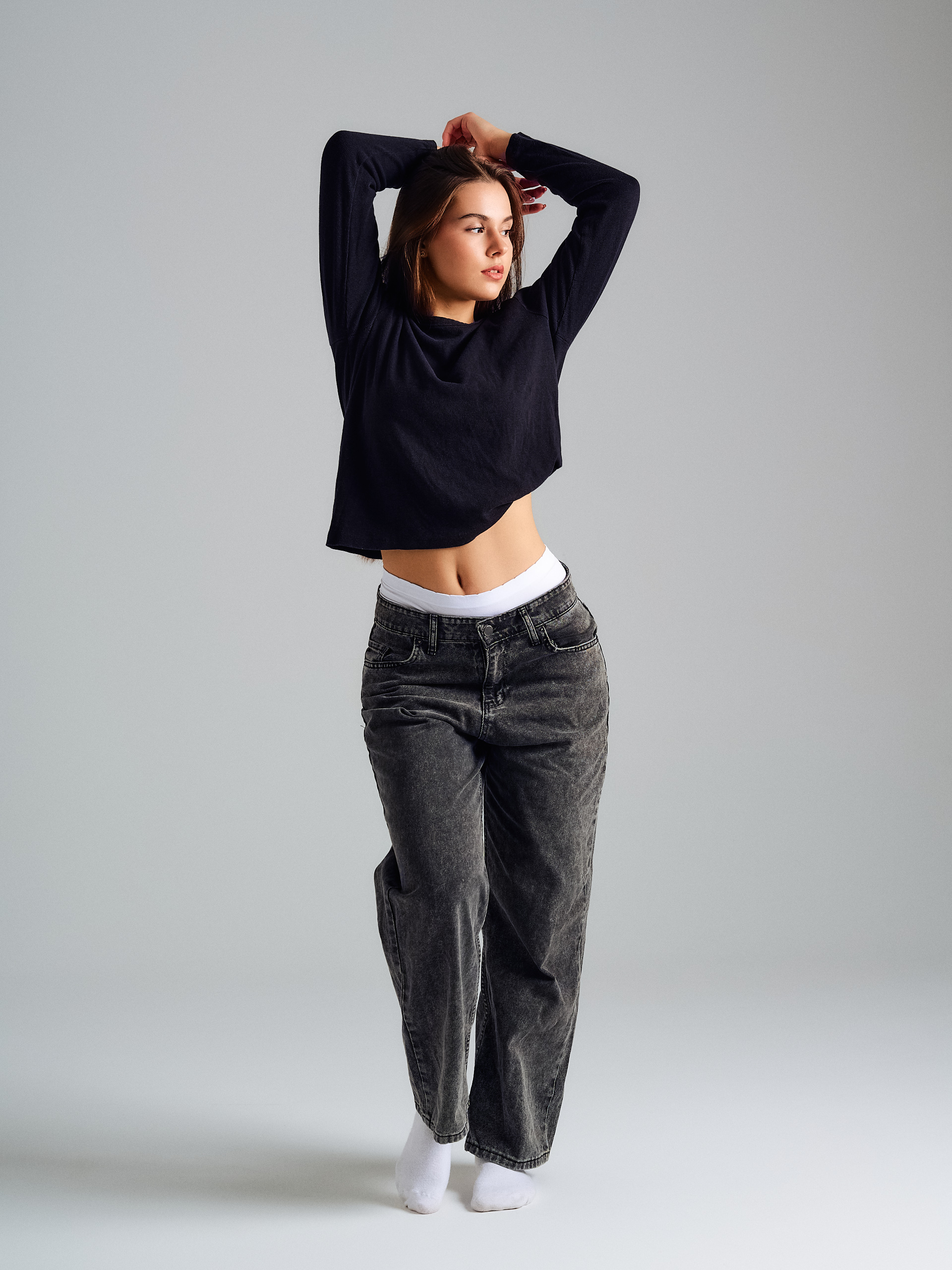 Sesja odbywa się w studio — miękkie, równomierne światło bez ostrych cieni, czyste białe lub jasne tło. Warunki są stałe i kontrolowane, żeby agencja widziała Ciebie, a nie efekty oświetlenia.